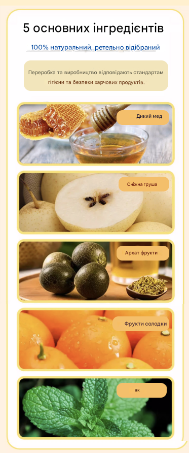Склад: тибетська груша, дикий мед, солодка, архат, та інші натуральні рослини.