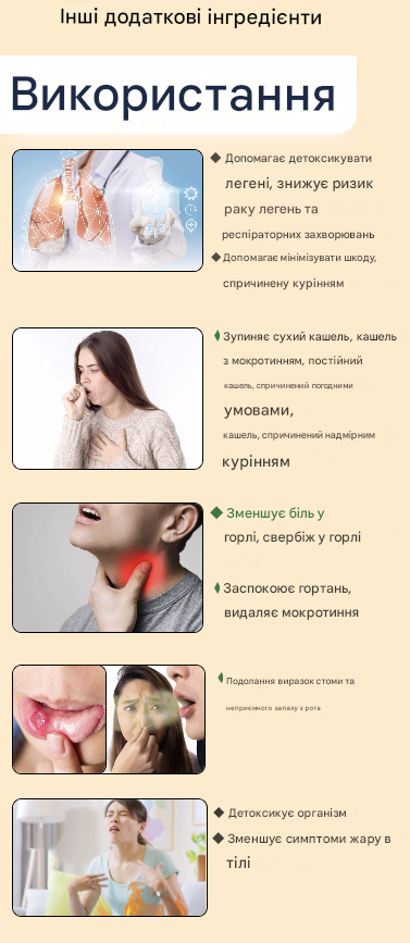 Допомагає очистити легені, протидіє шкідливому впливу куріння на організм