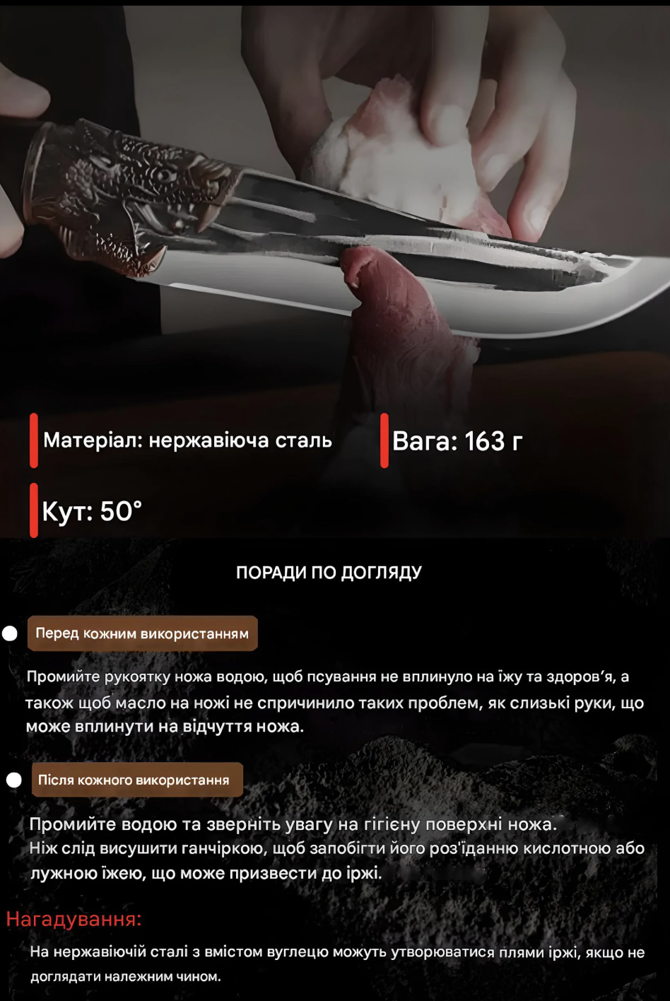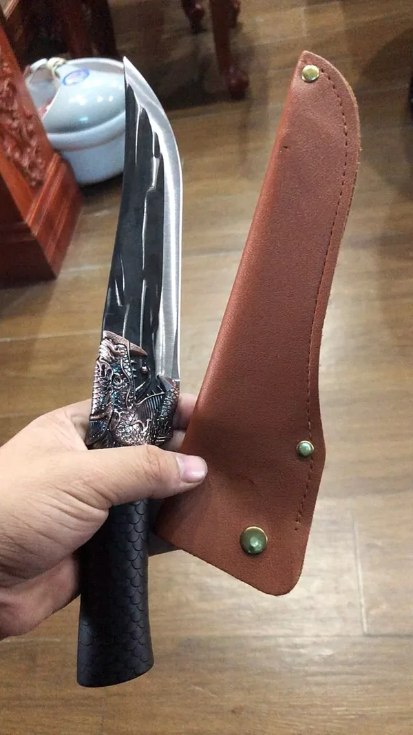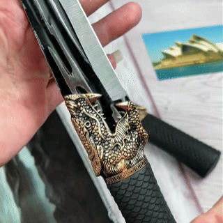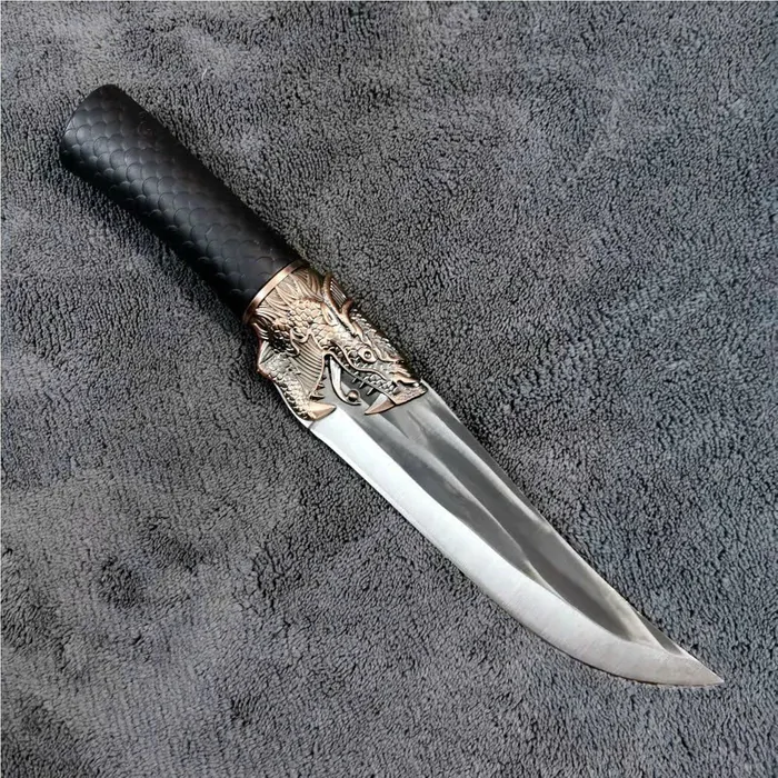 Декорована рукоятка у формі голови дракона робить ніж не тільки функціональним, а й стильним аксесуаром.