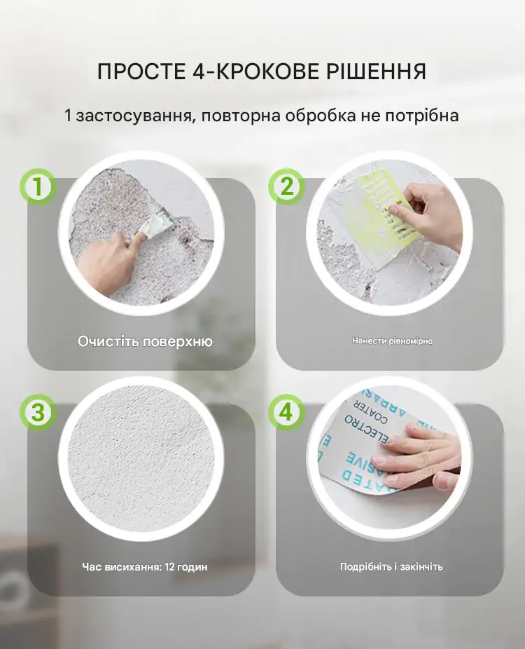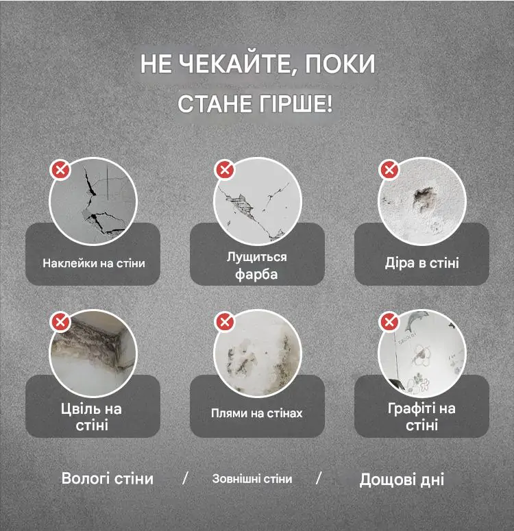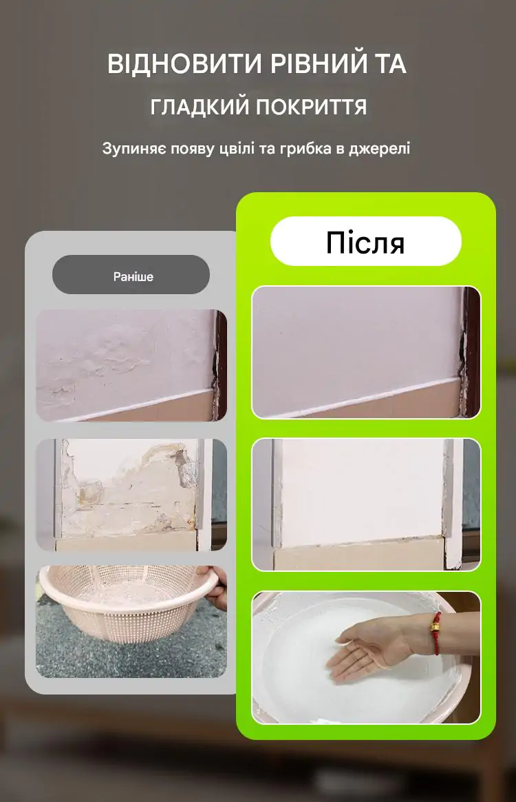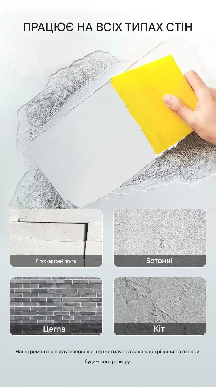 Придбав цю пасту для ремонту стін у гаражі, де була постійна вологість і цвіль. Після використання стіни виглядають як нові! Паста добре лягає, не має запаху і не залишає плям. Дуже задоволений результатом — тепер стіни не пітніють і не покриваються пліснявою.