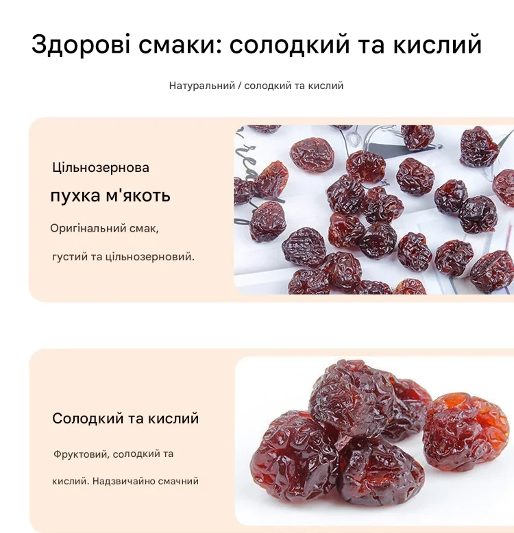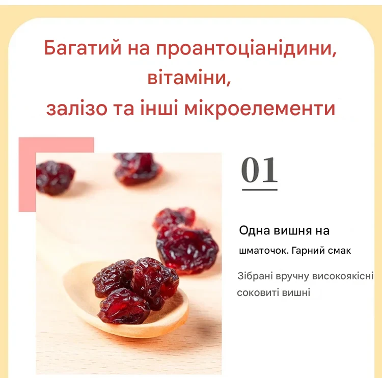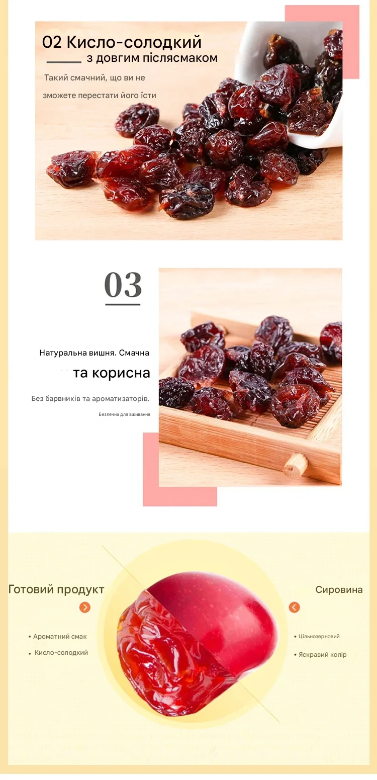 Приємно здивований! Справжній смак вишні, не пересушена, дуже корисний перекус.